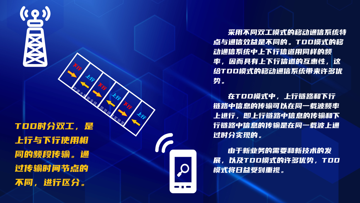 TDD是一種通信系統(tǒng)的雙工方式,在移動通信系統(tǒng)中用于分離接收與傳送信道(或上下行鏈路)。TDD模式的移動通信系統(tǒng)中接收和傳送是在同一頻率信道即載波的不同時隙,用保證時間來分離接收與傳送信道;而FDD模式的移動通信系統(tǒng)的接收和傳送是在分離的兩個對稱頻率信道上,用保證頻段來分離接收與傳送信道。